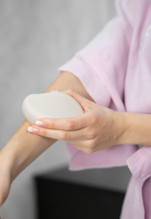 3. Haldið tólinu þétt við húðina og notið mjúkar hringlaga hreyfingar. Hreyfingin veldur því að hárin fjarlægjast af húðinni ásamt dauðum húðfrumum. Forðist að þrýsta of þétt á húðina til að koma í veg fyrir ertingu.